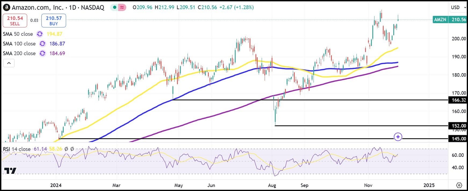 Amazon (AMZN) stock has gained nearly 2% on Monday as the world’s largest ecommerce business is rife with Cyber Monday deals, the internet’s answer to Black Friday sales ahead of the Christmas gift-giving holiday.