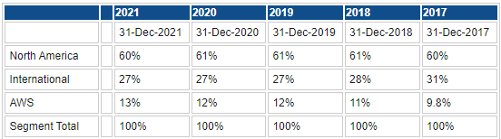 As we can see below, North America still represents the most important geographical driver of Amazon's profit, contributing 60% for the full year 2021. This, however, has been stable with AWS representing the main growth business.