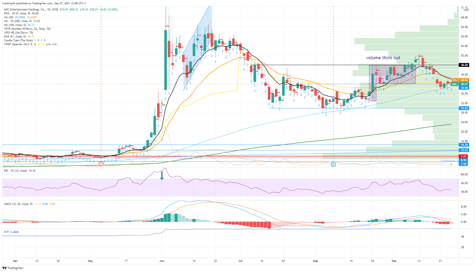 AMC stock has not participated in the rally that took off on Wednesday and has instead been fairly stable around the $40 level. This is an obvious psychological round number support but is also the breakout level from August 24 that acted as resistance. Now it is acting as support. AMC did retreat to $37, but as we can see from the daily chart below there is a strong volume profile-based support around here. The potential is there for a bounce. If only there was a big movie on the horizon to serve as a news catalyst. The name's Bond, James Bond.