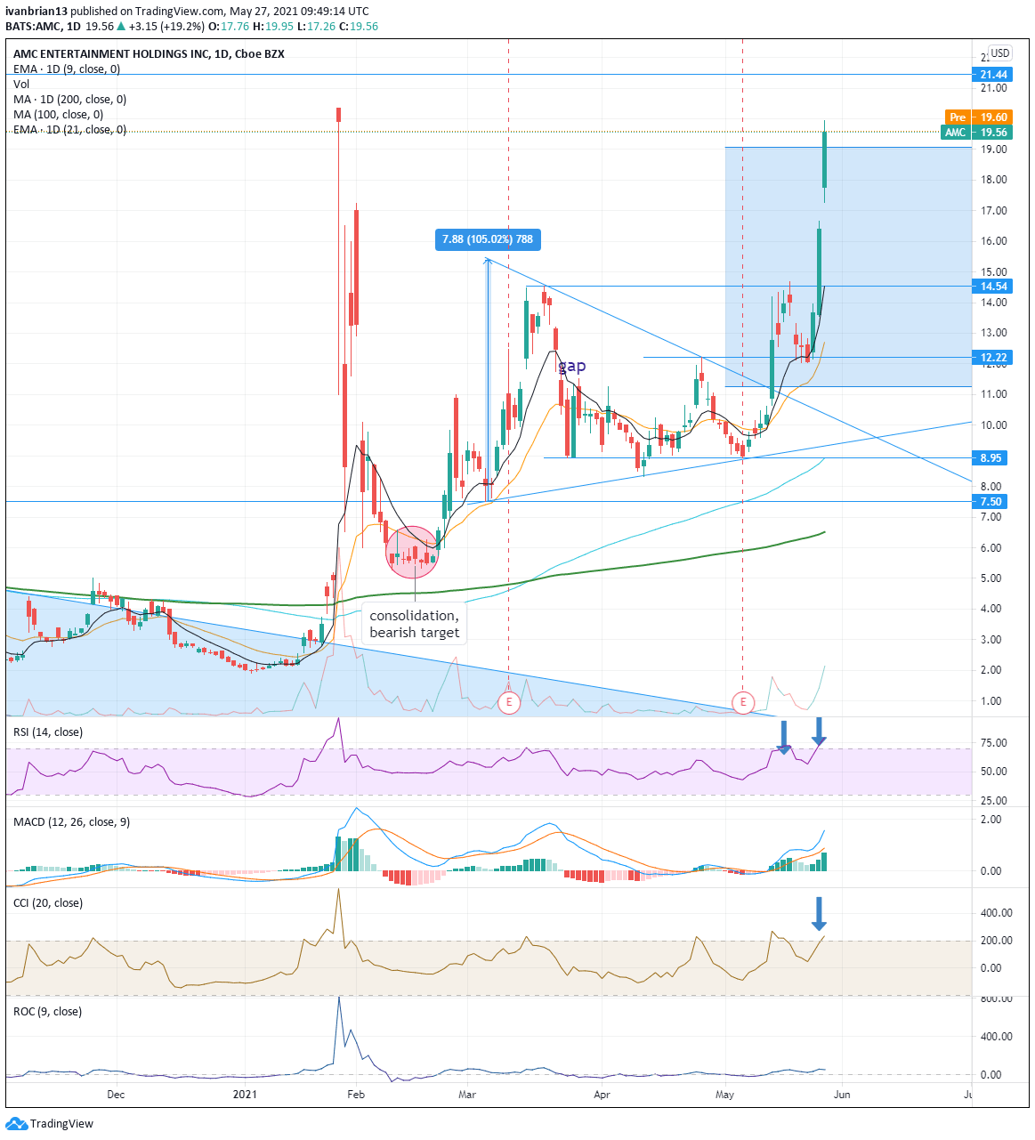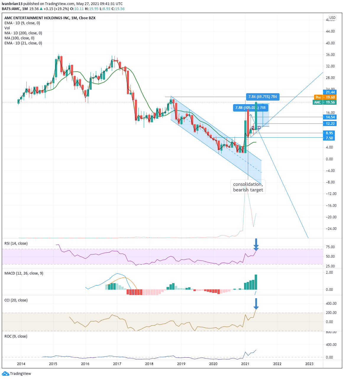 On Wednesday FXStreet examined the monthly chart for a longer-term overview of the move and how it had worked nicely from a technical perspective. The breakout in January was confirmed with a surge in volume and an almost perfect retracement and retesting of the $7.50 breakthrough level. The monthly chart also shows the nice base around $2.50 that AMC had formed and defended multiple times. AMC on the monthly chart shows clearly the next major resistance at $21.44 back from 2019.