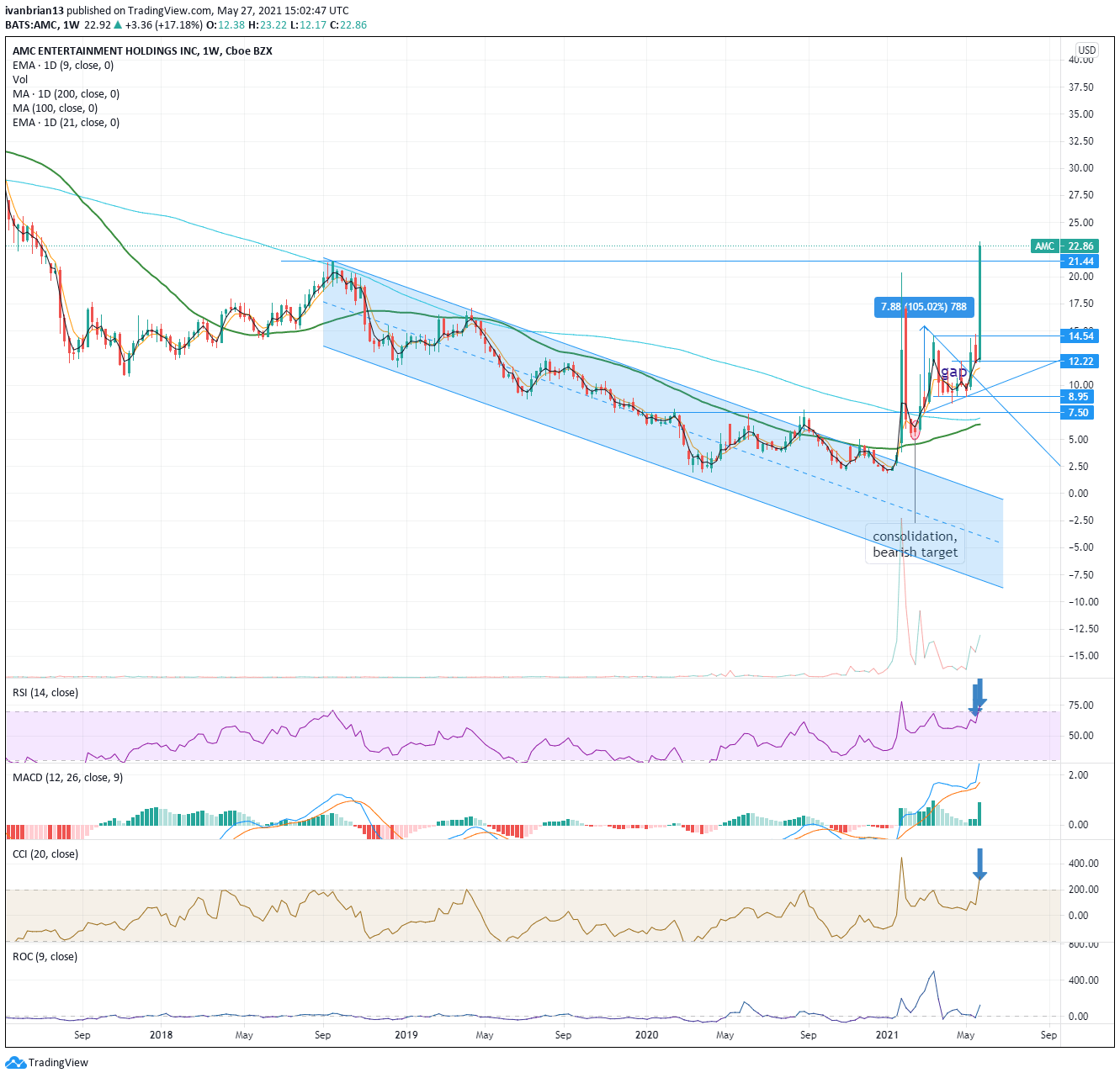 Update: To the moon! AMC is really not happy about the Gamestop movie being made and is determined to show those movie makers who the real star of the show should be. AMC smashes through the January $20.36 high on Thursday, while GameStop (GME) languishes well below its own January high. In the process, AMC shares take out the $21.44 high from September 2018. Caution should be ringing though as the RSI on the weekly chart is now nearly more overbought than back in January, this is confirmed by the Commodity Channel Index (CCI) another momentum indicator.