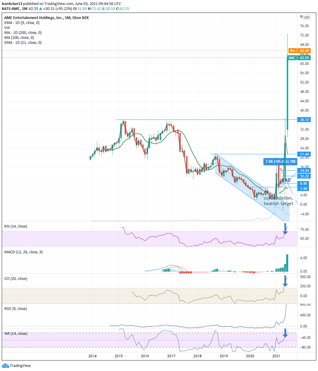 This target identified by FXStreet seems trivial now when you see AMC surge through $75 in Thursday's premarket. But clearly, we had the right idea. How high this can go is beyond forecasting now. Taking a longer-term monthly view shows the move in all its glory and shows Relative Strenght Index (RSI), Commodity Channel Index (CCI), and Williams %R as hugely overbought, at record overbought levels. Like all good things, this will likely come to an end to please have a plan and risk management in place if or when it does.