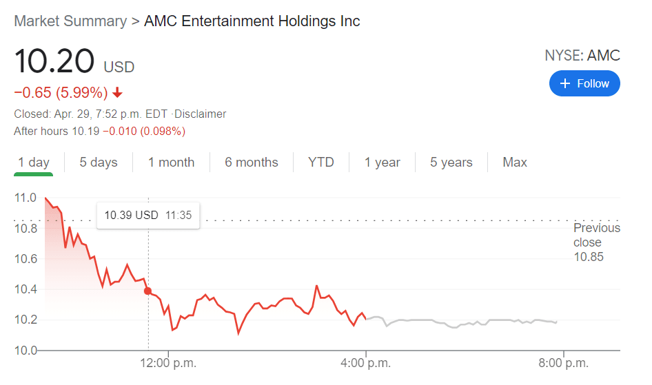 NYSE:AMC has continued along its volatile path set earlier in the year by the meme stock short squeeze, with another turbulent month in April. On Thursday, shares fell 5.99% to close the trading session at $10.20, alongside a selloff for the broader markets. It is the second straight trading day where AMC has crashed, after several microeconomic factors have caused investor sentiment to sour. AMC experienced a small surge after all of its cinema locations were able to open after most U.S. states received reopening orders following a mass COVID-19 vaccination effort.