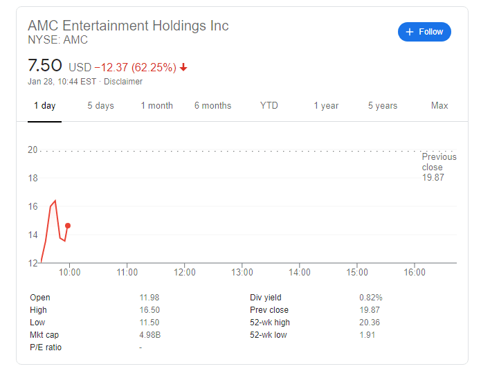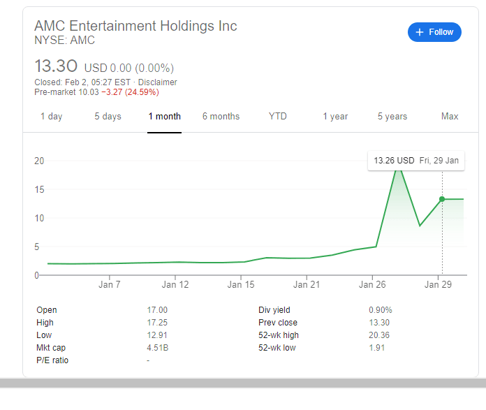Update: Shares in AMC rallied strongly on Friday, up nearly 50% during the pre-market session. AMC was one of the favourite stocks of the /wallstreetbets phenomenon as AMC had a large short interest and was squeezed higher as a result.