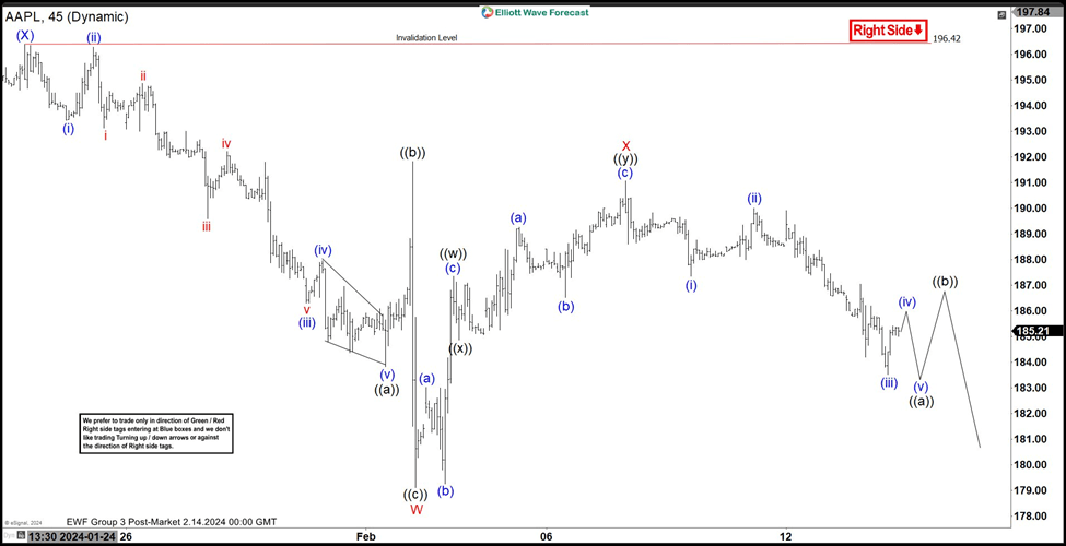 Apple (AAPL) made a new all-time high on December 14, 2023 at 199.62. Down from there, a correction is in progress with internal subdivision as a double three Elliott Wave structure. Down from 12.14.2023, wave (W) ended at 179.68 and wave (X) ended at 196.42 as the 45 minutes chart below shows. Wave (Y) lower is in progress with internal structure as another double three in lesser degree. Down from wave (X), wave ((a)) ended at 183.81 and wave ((b)) ended at 191.81. Wave ((c)) lower ended at 179.10 which completed wave W. Up from there, wave ((w)) ended at 187.33 and wave ((x)) ended at 184.85. Wave ((y)) ended at 191.05 which completed wave X.