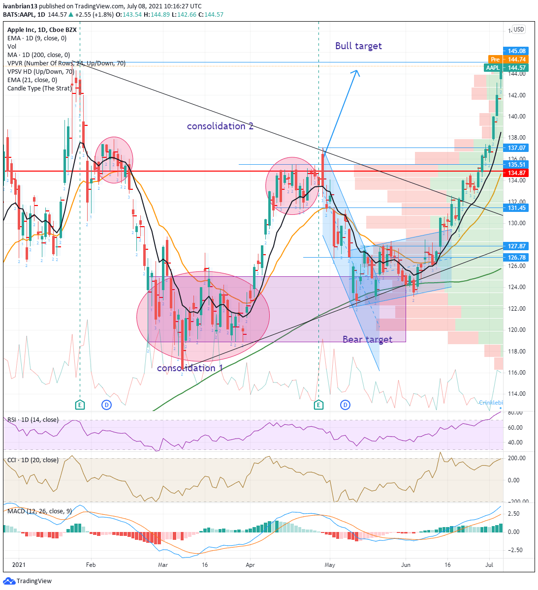 Apple stock more or less hit our target of fresh all-time highs on Wednesday, but what is 16 cents between friends? You should be our friend as we have been calling this one higher for some time. On June 23 FXStreet first mentioned taking out record highs (see here), calling the support base at $122 since early June. The move accelerated once AAPL stock broke above $135 and then $137 as the volume profile thinned out above these levels. The acceleration though has now sent AAPL into overbought territory on the Relative Strength Index (RSI), and this corresponds with the Nasdaq and S&P 500 both also being overbought, according to the RSI. It should be noted that the RSI being overbought does not mean prices have to fall in order for the RSI to go back down. The RSI is concerned with the relative speed of the move. If prices slow or consolidate, the RSI will fall. However, it is a good indicator that things have become stretched.