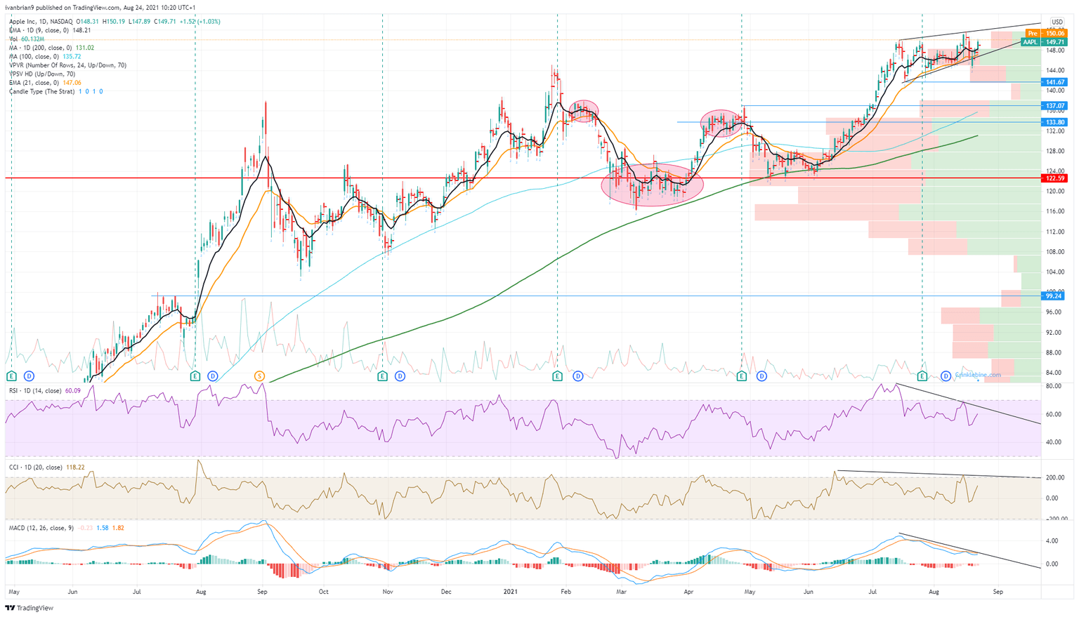 The big unknown in all of this is when does the Fed begin to taper. We have spoken previously here at FXStreet of the massive correlation between the Fed's asset purchases and balance sheet and the stock market. Logically then, a tapering should see a sell-off or at least cooling. Apple, despite its healthy and strong business, is unlikely to remain bullish if the overall market turns bearish. So in the medium to longer-term, some caution is needed. However, in the short term, Apple has returned to its bullish pennant or wedge formation. We can put last week's dip down to a false break. The top of the wedge is at $152, the first resistance. We are still exhibiting some bearish divergences though in the Relative Strength Index (RSI), Commodity Channel Index (CCI) and Moving Average Convergence Divergence (MACD). All three are trending lower despite Apple stock trending higher. A breakout is needed to confirm the bullishness. $141.67 remains key, and above here the bullish trend is still healthy. A break of $141.67 and the move should accelerate to $133.80 due to the volume shelf.
