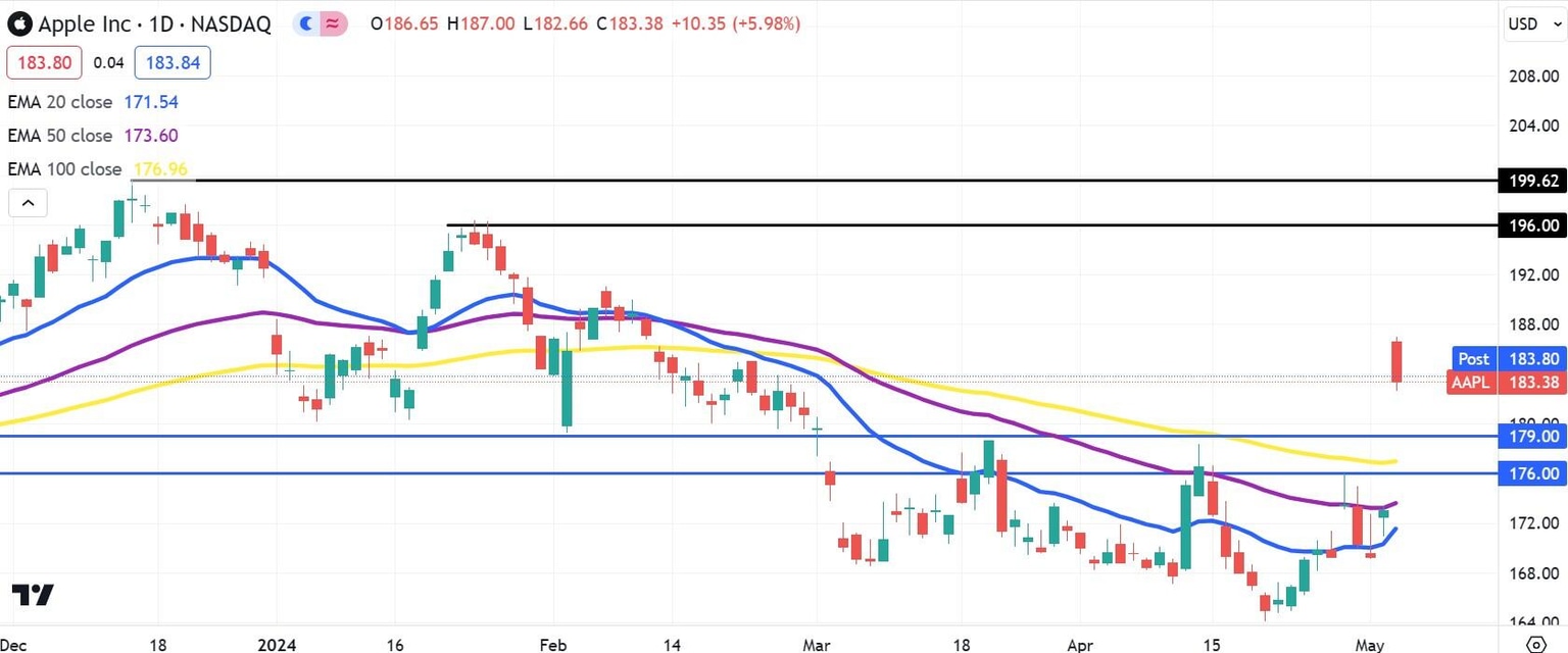 Now that all might change. Expect bulls to push up Apple stock at least to the $196 level, where investors discovered resistance back in January. Above here lies the all-time high of $199.62 from December 14, 2023.