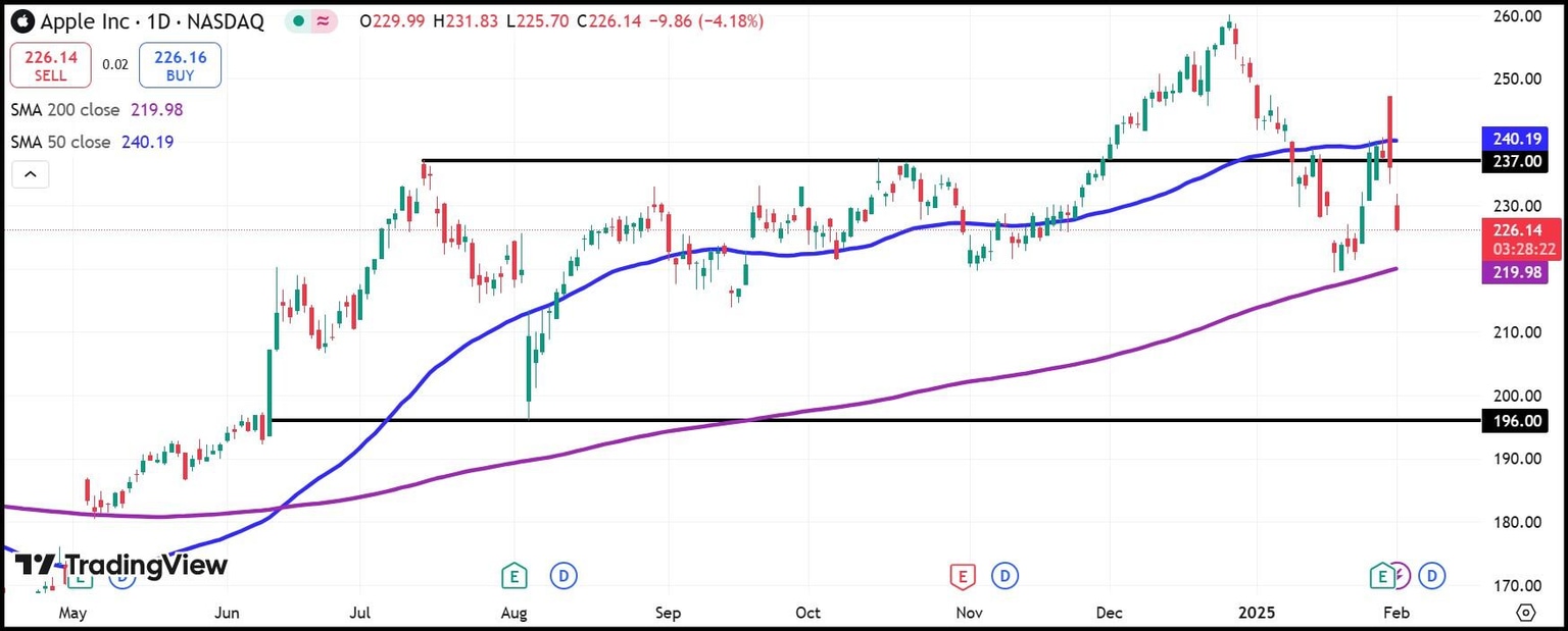 Sitting near $220 at present, the 200-day SMA hasn't been tested since May 2024, about nine months ago. The $220 level is also key for traders since it held up as support on November 5, 2024, and again two weeks ago on January 21 and 22 of this year. Any break below $220 will send traders scrambling since the next real support comes at $196. That level halted the downside during the August 5, 2024 market massacre and also acted as momentary resistance in June 2024.