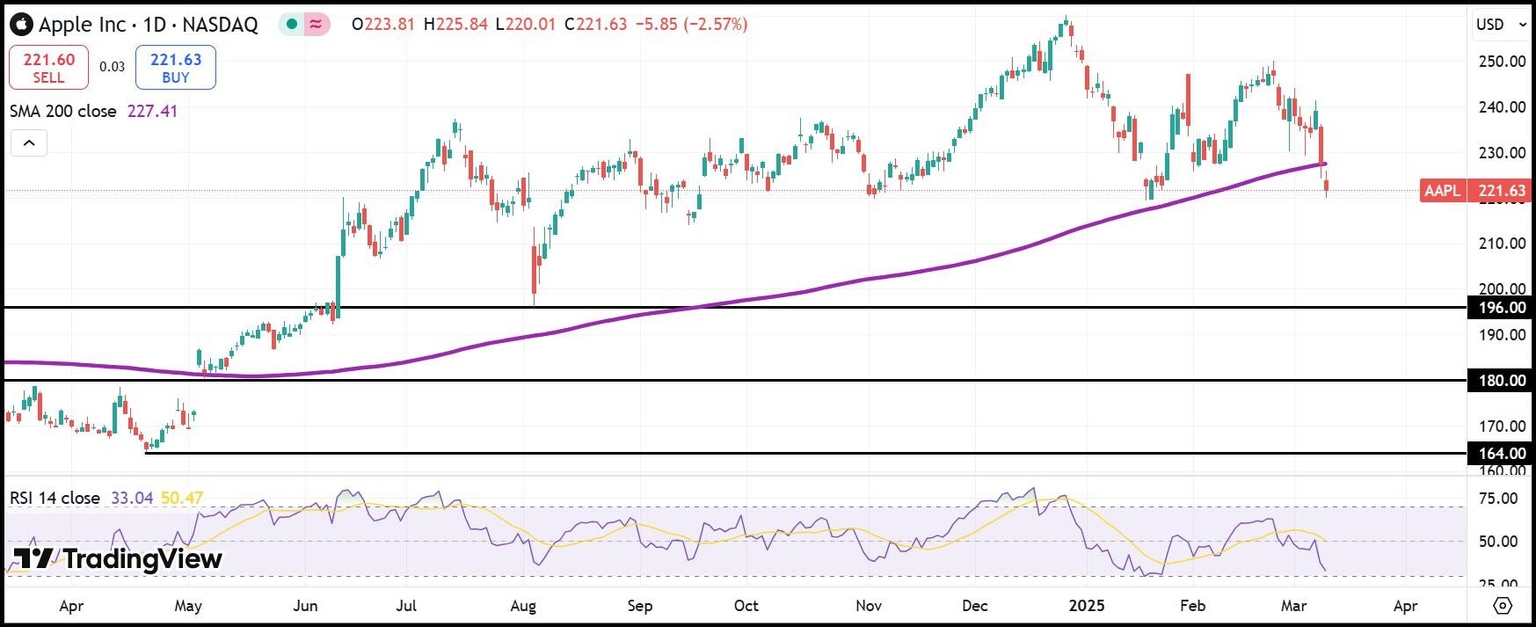 Apple stock sinks beneath 200-day moving average as Trump raises Canadian tariffs