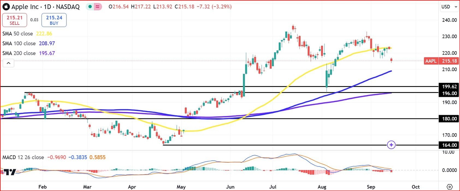 Apple stock is in retreat after its August 29 range high, which happened to be a lower high. Therefore, it's natural that the market will look to notable support levels. The next one comes at $210 near the 100-day Simple Moving Average (SMA). After that the 200-day SMA comes near prior resistance turned support at $196.