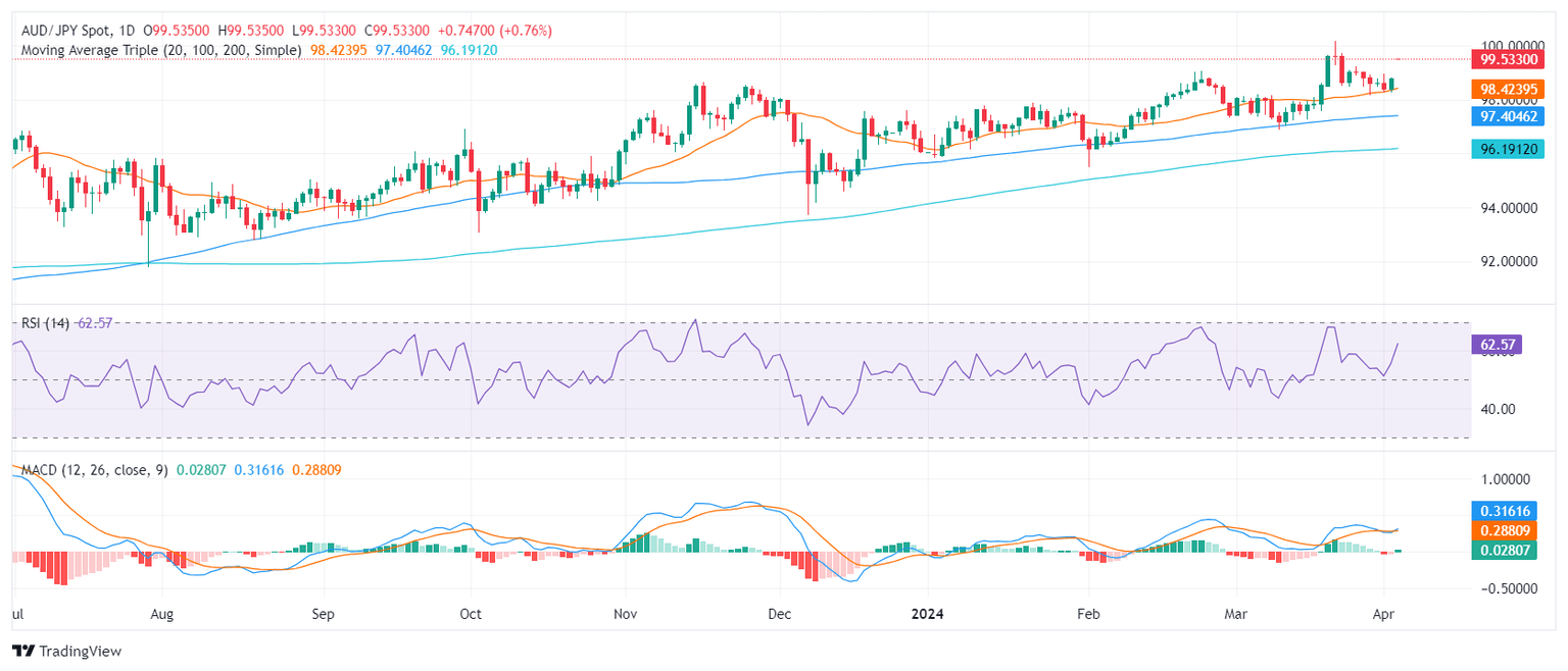 In Wednesday's session, the AUD/JPY pair is trading at 99.58, following an increase of 0.82%. Buyers appear in control, but indicators are flashing signals of a short-term consolidation.