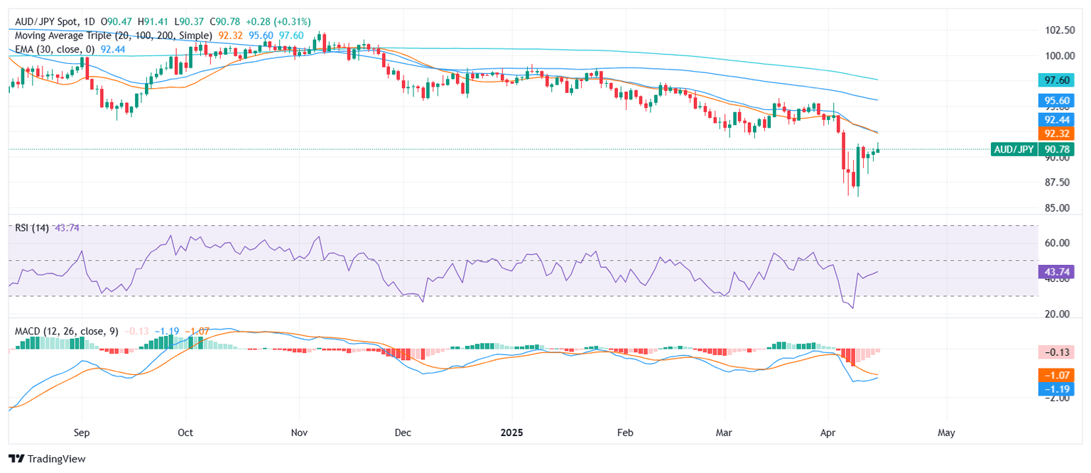 The AUD/JPY pair advanced on Tuesday, rising toward the upper end of its daily range and hovering near the 90.90 area ahead of the Asian session. The cross posted modest intraday gains, though the broader technical structure still points south as moving averages and trend signals maintain a bearish stance.