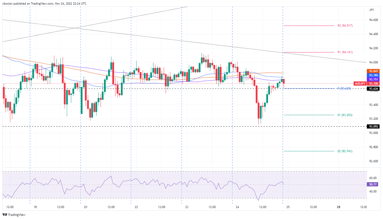 The Australian Dollar (AUD) edges lower against the Japanese Yen (JPY) after traveling throughout the day within the 94.00-93.11 range on Thursday, hoovering below the 50 and 100-day Exponential Moving Averages (EMAs). As the Asian Pacific session begins, the AUD/JPY is trading at 93.70, below its opening price by 0.20%.