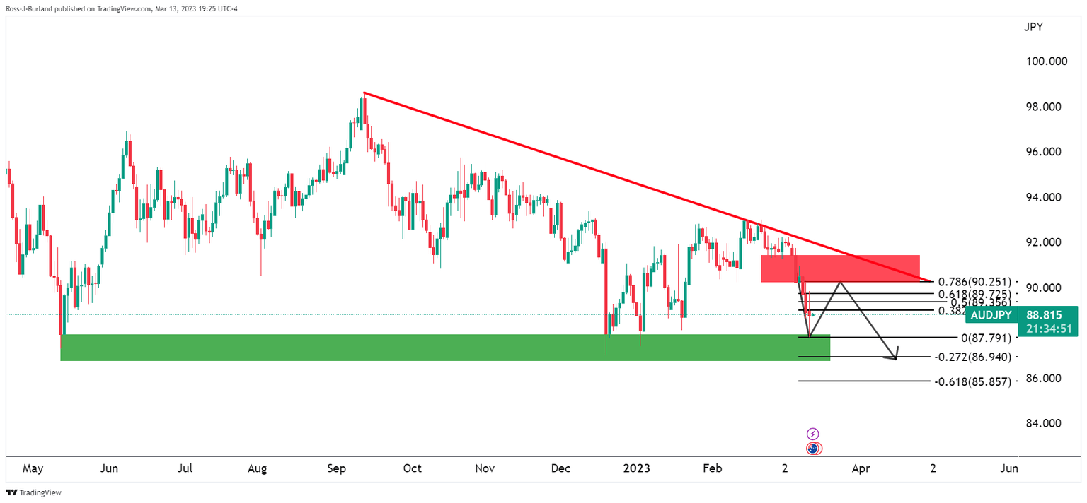 AUD/JPY is flat on the day so far approaching the Tokyo open, trading at 88.67 and sticking to a 20 pip range so far. The bulls are stepping in from daily support with prospects of a bullish correction towards prior support that would now be regarded as resistance. Pulling up the Fibonacci scale, there is an alignment with the 78.6% Fibonacci resistance near to 90.25: