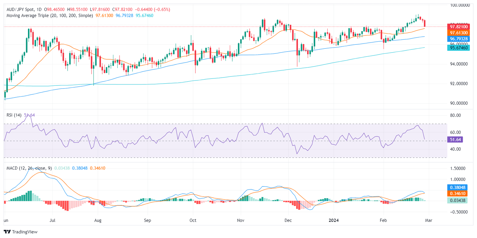 - The AUD/JPY is currently trading at around 97.90, reflecting a decrease of 0.55% in Wednesday's session.