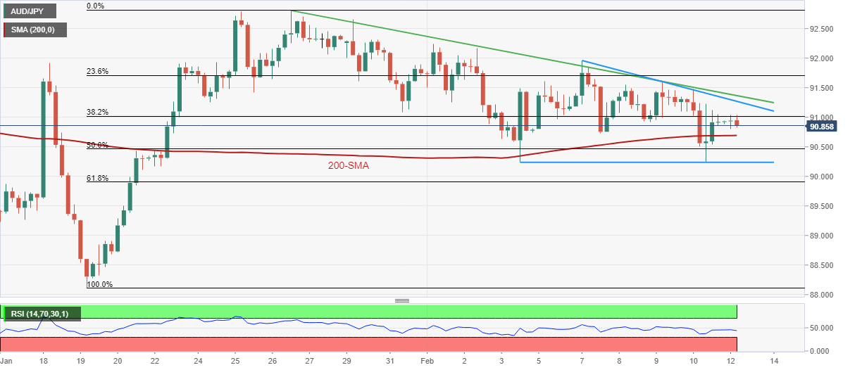 AUD/JPY Price Analysis: Bullish triangle, 200-SMA probe bears near 91.00