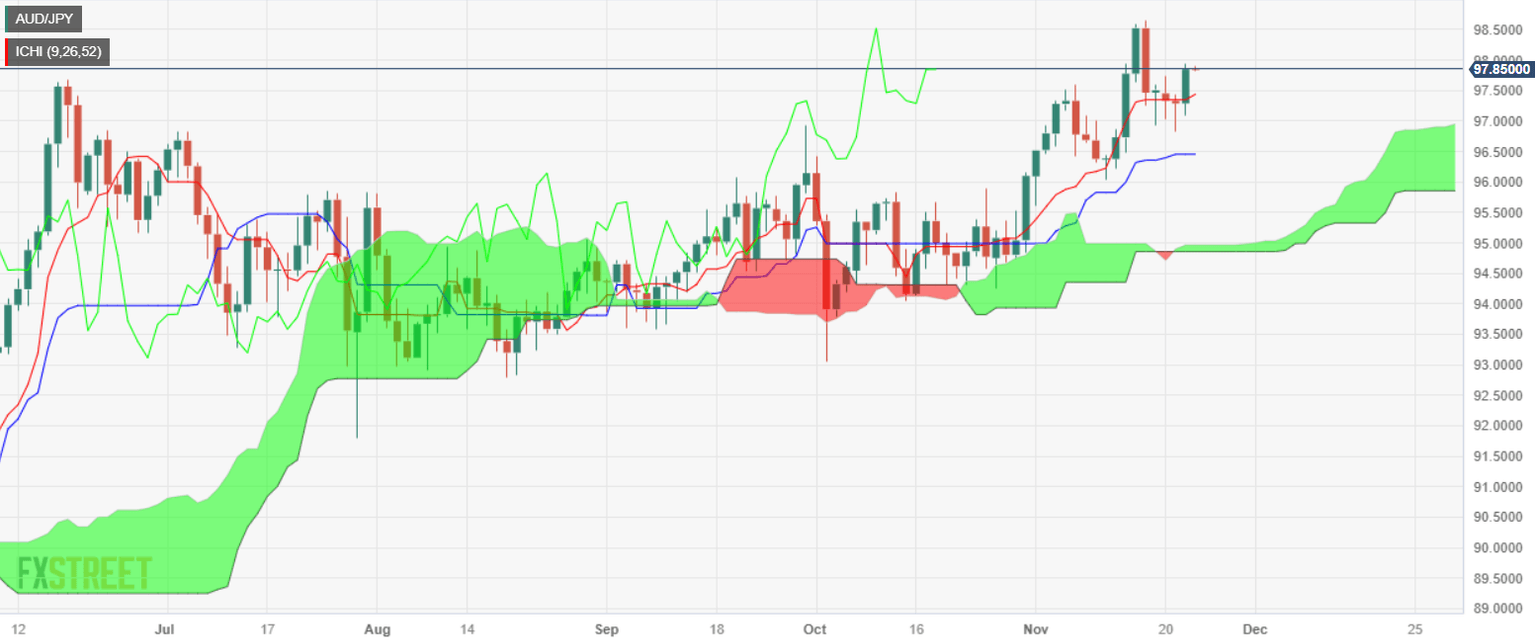 - AUD/JPY remains bullish in the near term after bulls reclaimed the Kijun-Sen, eyeing 98.00.
