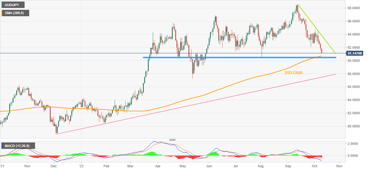 AUD/JPY bears renew the two-month low as they poke 91.15 level heading into Tuesday’s European session. In doing so, the cross-currency pair drops for the fourth consecutive day.