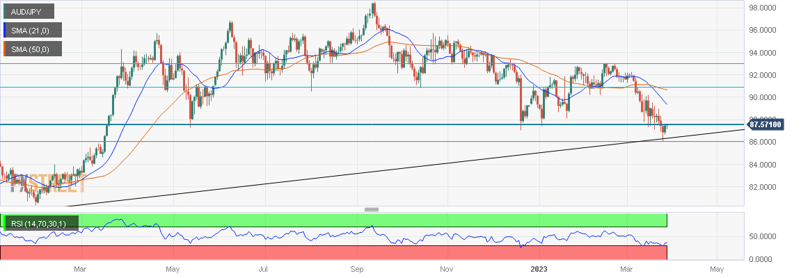 The risk proxy AUD/JPY has fallen sharply after reaching the March high near the 92.00 psychological mark on a daily timeframe, as demand for the safe-haven Japanese Yen surged amid the global banking liquidity crisis.