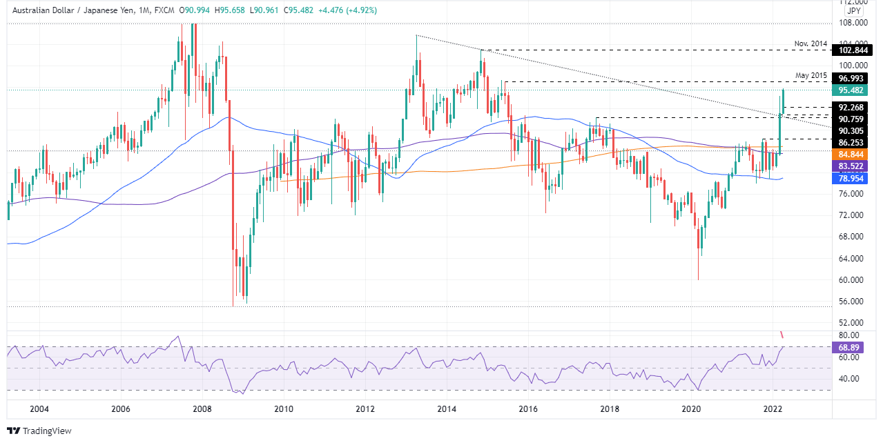 To the upside, the AUD/JPY’s first resistance would be May 2015 highs around 97.30. Once cleared, the next resistance would be the 100.00 mark, and then the November 2014 highs near 102.84. On the flip side, the AUD/JPY first support would be the abovementioned downslope trendline around the 90.50-70 area. A breach of the latter would pave the way for further losses. The following support would be the October 2021 highs around 86.25 and then the 200-month simple moving average (SMA) at 84.84.