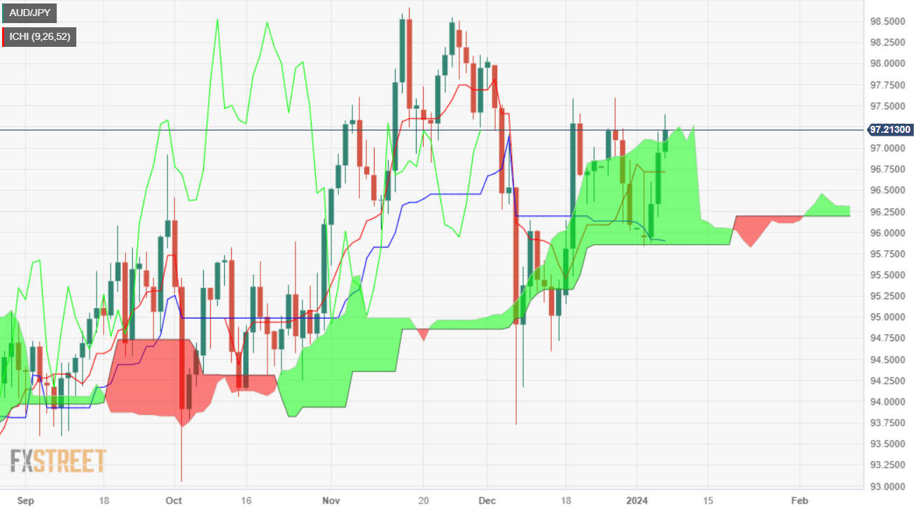 The AUD/JPY is set to finish the week with gains of close to 1.20%, though it remains at the brisk of getting back inside the Ichimoku Cloud (Kumo), which could pave the way for a pullback. At the time of writing, the pair trades at 97.20, posting modest gains of 0.24% after hitting a daily low of 96.83.