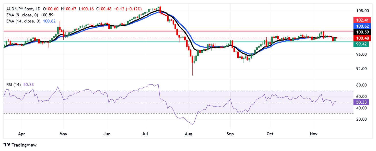 To the upside, the AUD/JPY cross is testing immediate resistance at the nine-day EMA around the 100.58 level, followed by the 100.61 level. A break above these levels could trigger a bullish bias, potentially pushing the currency cross toward the four-month high of 102.41, reached on November 7.