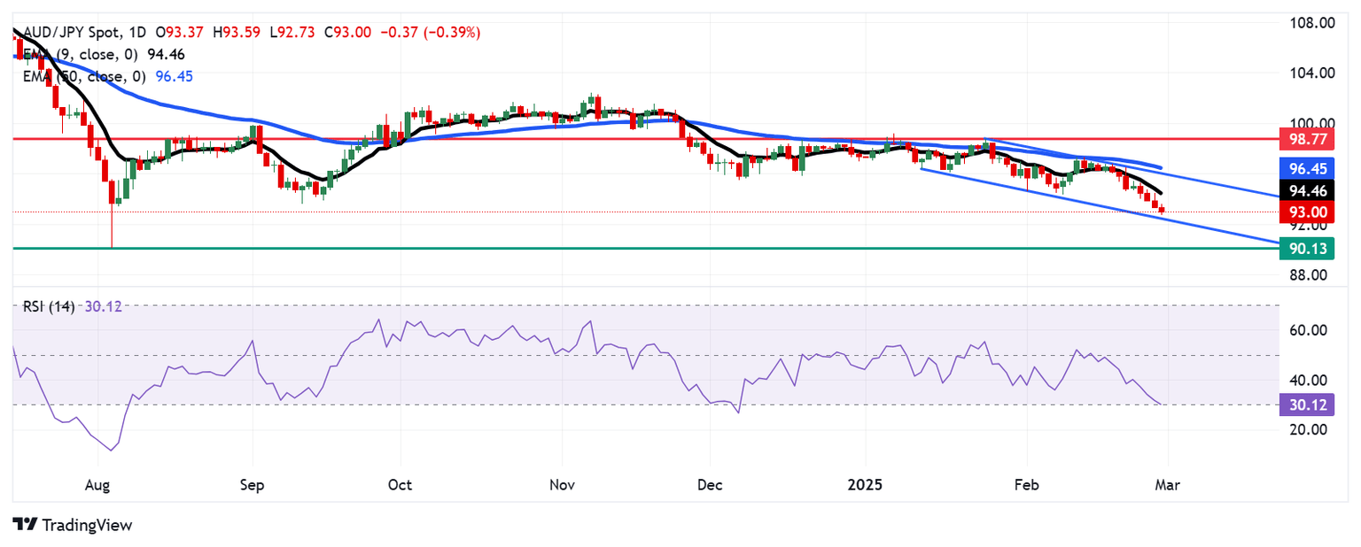 AUD/JPY Price Forecast: Tests 93.00 support, eyes on descending channel’s lower boundary