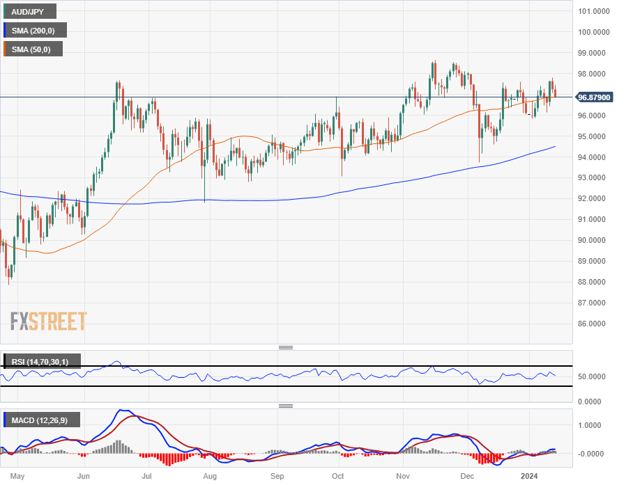 The Aussie’s dip against the Japanese Yen on Friday sends the AUD/JPY falling back into the 200-hour Simple Moving Average (SMA) near 96.90, and the pair is at risk of further entrenching into a medium-term consolidation pattern that has plagued the AUD/JPY since November.