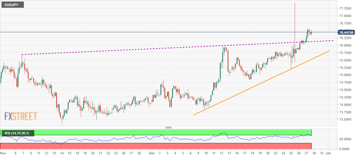 AUD/JPY trades around 76.45 amid Monday’s Asian session. The quote is little changed from Friday’s conditions where it lacked the courage to extend the run-up beyond May’s high. The same could be traced from overbought conditions of the 14-bar Relative Strength Index (RSI).