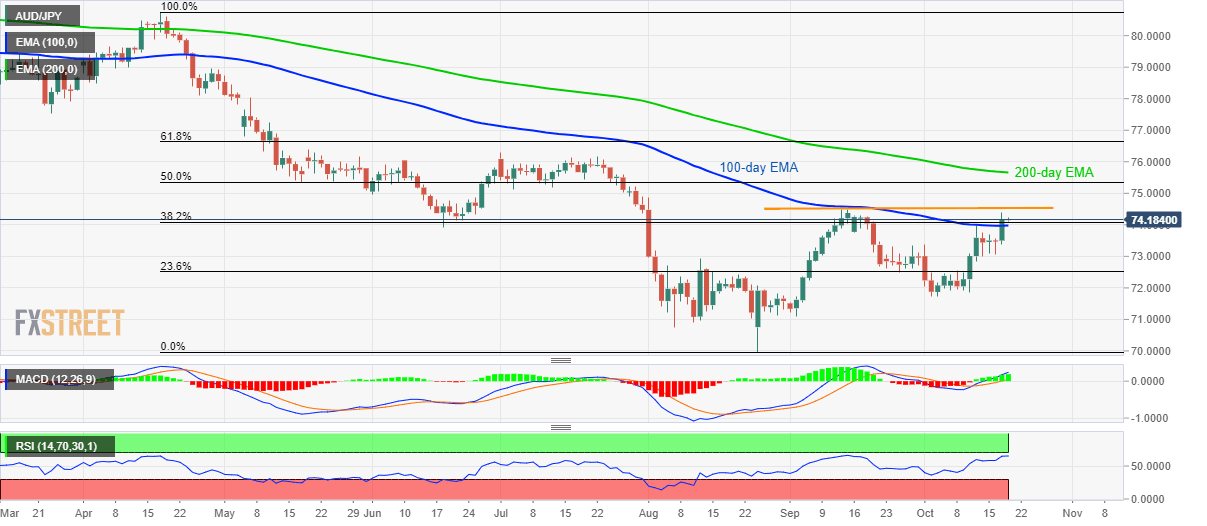 Despite successfully clearing 100-day Exponential Moving Average (EMA) for the first since late-April, AUD/JPY still trades below September month high while flashing 74.20 as a quote on early Asian morning session on Friday.