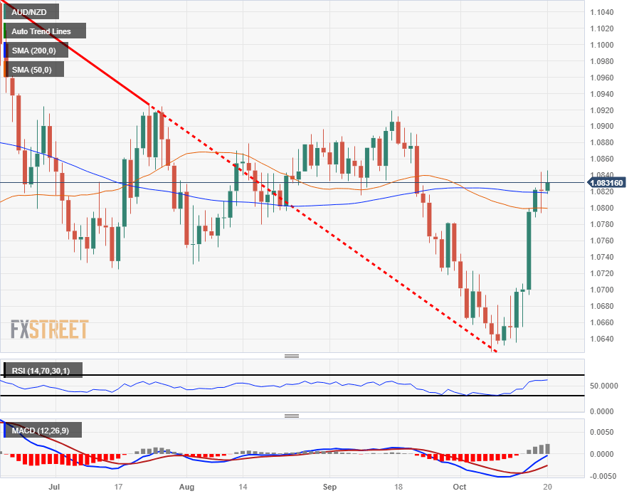 The Aussie's aggressive rise against the Kiwi this week sees the AUD/NZD eating away a majority of September and early October's losses, but bullish momentum is set to return to consolidation as the pair closes out Friday action tangling with the 200-day Simple Moving Average (SMA), and AUD/NZD traders will enter Monday markets looking at familiar consolidation for the pair.