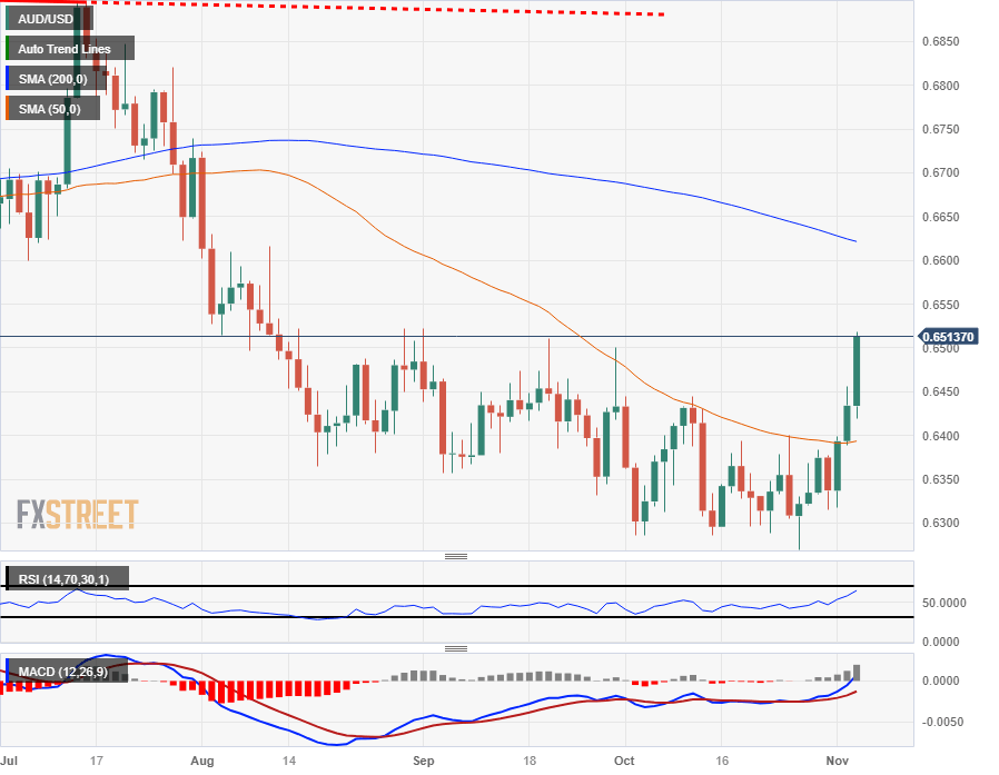 The AUD/USD is pinning into a nine-week high bid above the 0.6500 handle as the Aussie (AUD) capitalizes on US Dollar (USD) weakness following a flubbed Nonfarm Payrolls reading, and risk-on market sentiment is sending the Aussie into its sixth green candle out of the last seven consecutive trading days.