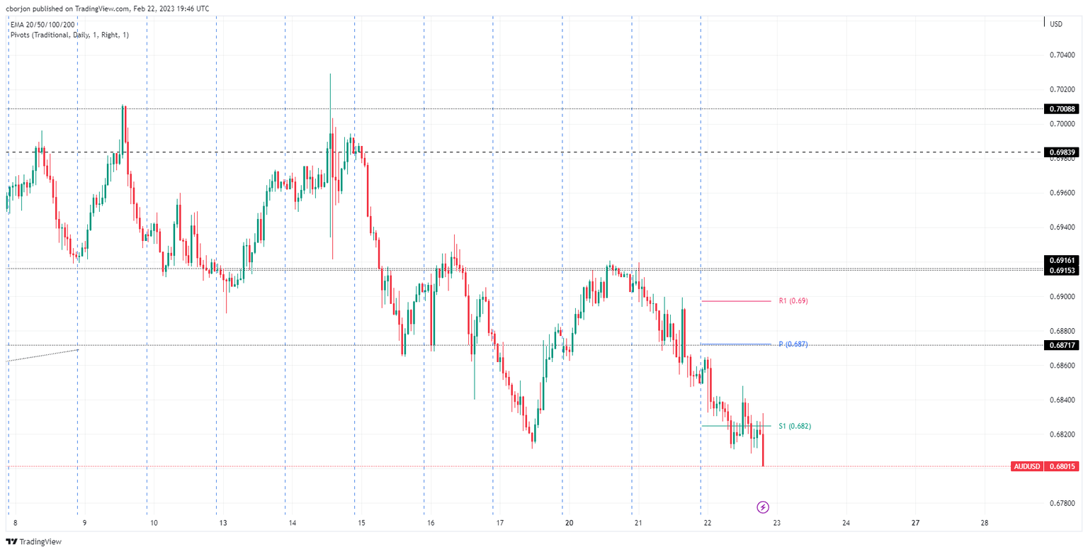 The AUD/USD 1-hour chart shows a spike towards 0.6832 before the AUD/USD reversed its course, breaching south of the S1 daily pivot point at 0.6825. It should be said that volatility has increased, and after reaching a low of 0.6808, as of late, the AUD/USD is tumbling sharply, eyeing a break below the 0.6700 mark.