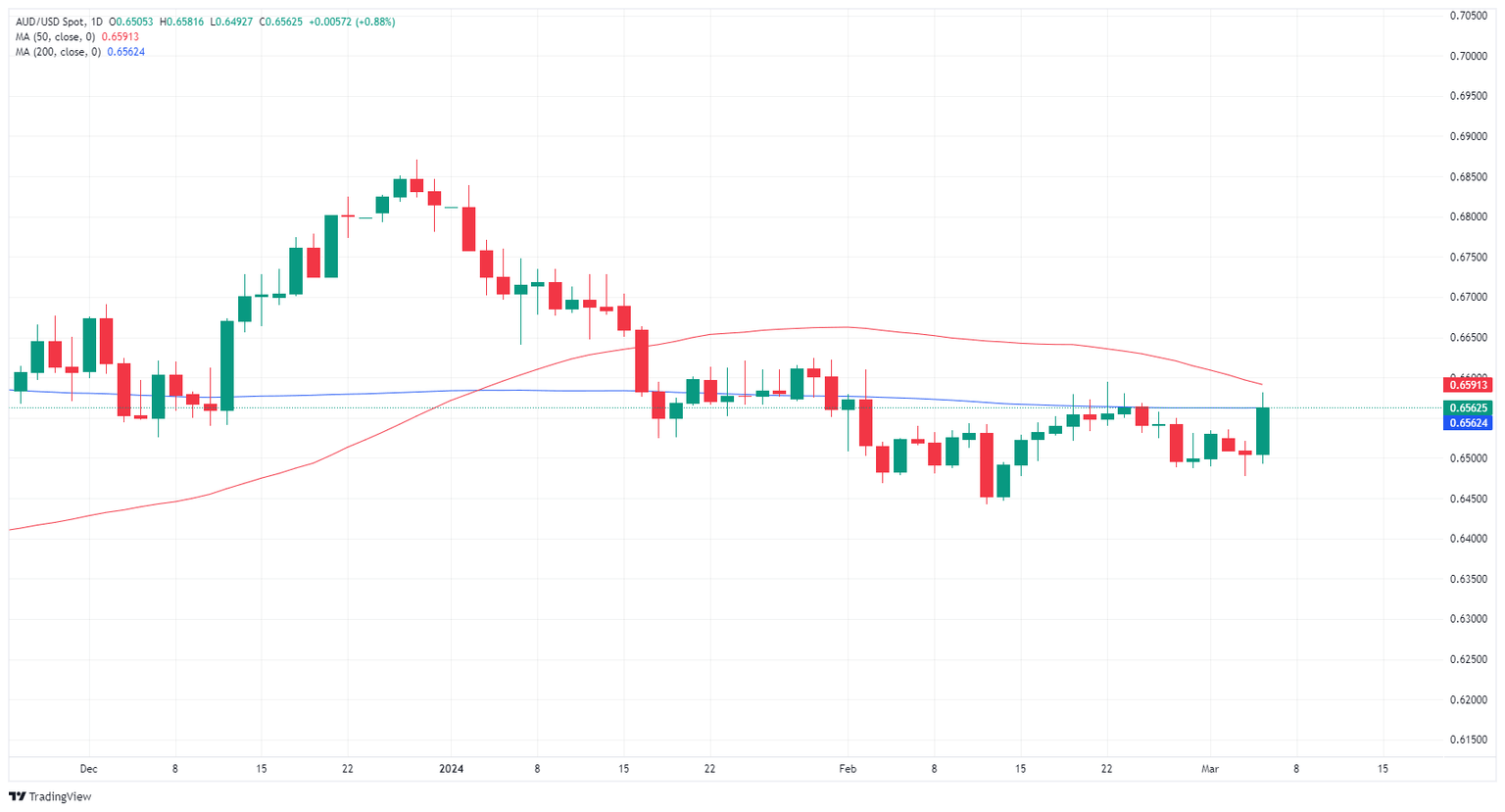 Wednesday’s bullish candle represents one of the pair’s strongest performances since December, but the pair has run into a technical ceiling at the 200-day Simple Moving Average (SMA) near 0.6560, and bullish momentum is set to falter back into the 0.6500 handle is sellers return to the fold.
