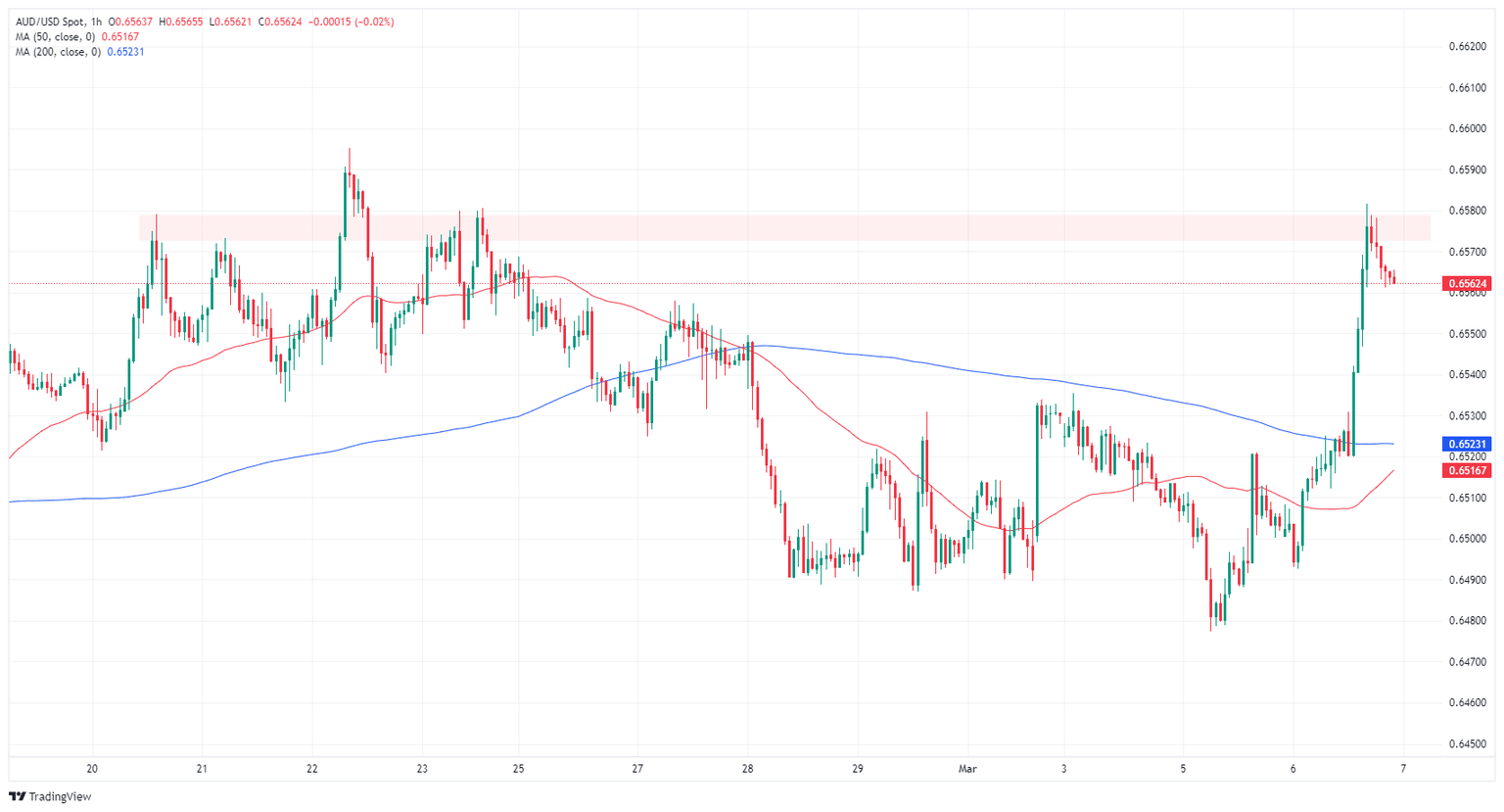 AUD/USD knocked into a two-week high near 0.6580 after Federal Reserve (Fed) Chairman Jerome Powell kicked the legs out from underneath the US Dollar (USD) on Wednesday. Fed Chair Powell noted that the Fed doesn’t see increased risk of an economic recession in the US this year while testifying before the US Congressional House Financial Services Committee. The head of the US central bank is expected to deliver further comments on Thursday when he appears for day two of the Fed’s Semi-Annual Monetary Policy Report.
