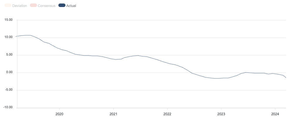 The Chinese House Price Index showed a decline in house prices of minus 1.4% in February from minus 0.7% in the previous month of January, according to data from the National Bureau of Statistics of China, released early Friday. This continues the down trend in Chinese house prices since 2019.