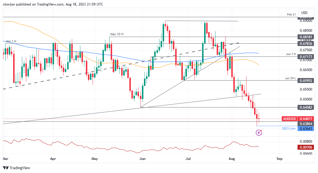 AUD/USD registers minuscule losses though it registered weekly losses of 1.41%, as market sentiment remained downbeat amid China’s economic developments, denting investors’ mood. That, alongside global bond yields portraying traders expecting additional tightening, kept the Australian Dollar (AUD) pressured for the eighth consecutive day. The AUD/USD finished the week trading at 0.6401, down 0.02%.