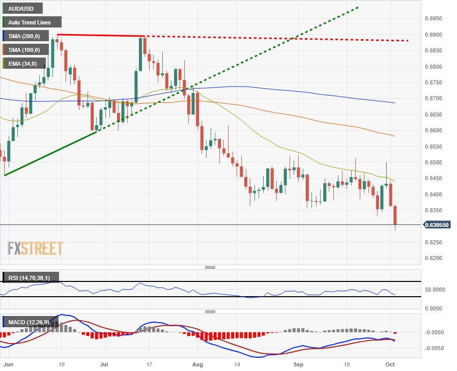The AUD/USD extended declines for Tuesday, tumbling into the 0.6300 handle and is struggling to find bid support as broad-market risk appetite favors the US Dollar.