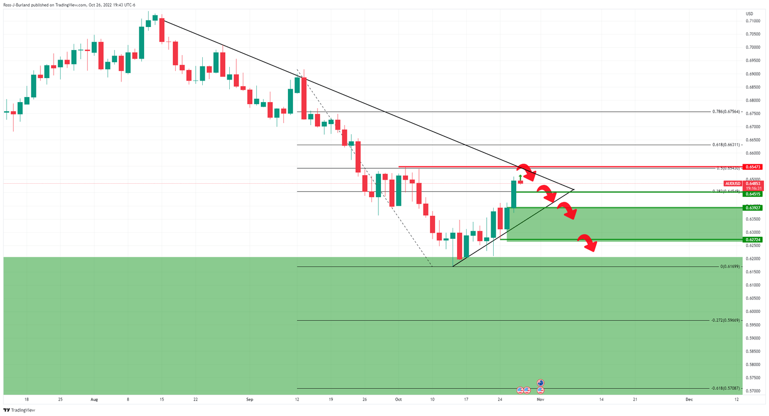 AUD/USD is reaching toward a trendline resistance and horizontal resistance on the daily chart and could be on the verge of capitulation given the timing of the week as we head into the last two days of sessions with key events coming up on the calendar. The following illustrates the potential for the downside into the London and US sessions after a fresh high that has been put in in Asia, so far.