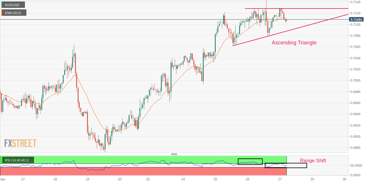 On an hourly scale, AUD/USD is oscillating in an Ascending Triangle chart pattern that indicates a sheer contraction in volatility. The upward-sloping trendline of the chart pattern is plotted from January 25 average price at 0.7061 while the horizontal resistance is placed from January 26 high around 0.7140.