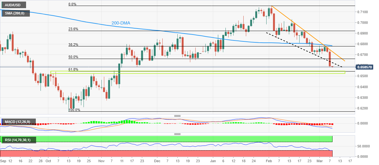 AUD/USD bears keep the reins at a four-month low, making rounds to 0.6580-90 during early Wednesday, following the biggest daily slump in a month.