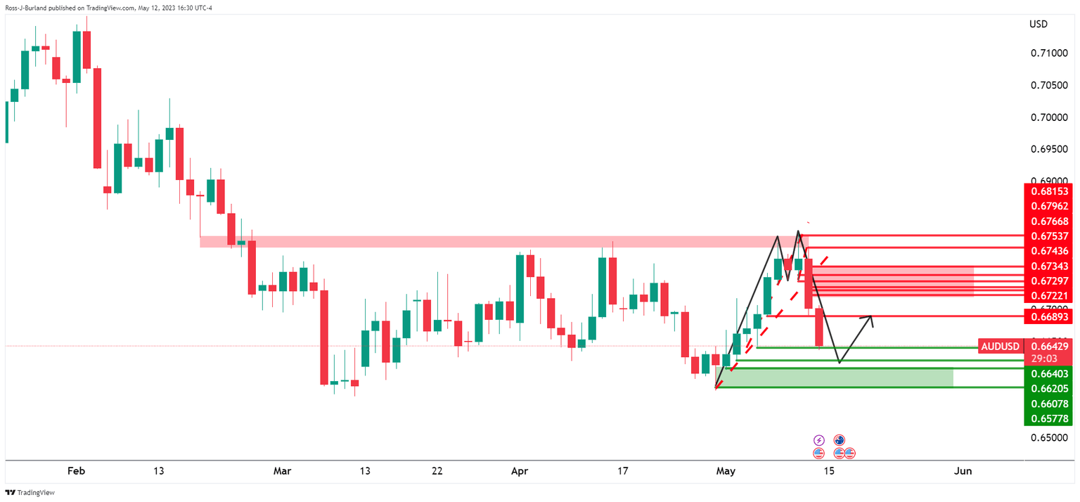 AUD/USD could be on the verge of moving back inside of the sell-off range. The M-formation is a reversion pattern and a deceleration of the sell-off would be expected as the market moves in on support. The following illustrates this on the daily charts and also looks at the prospects on the hourly chart for the open next week.