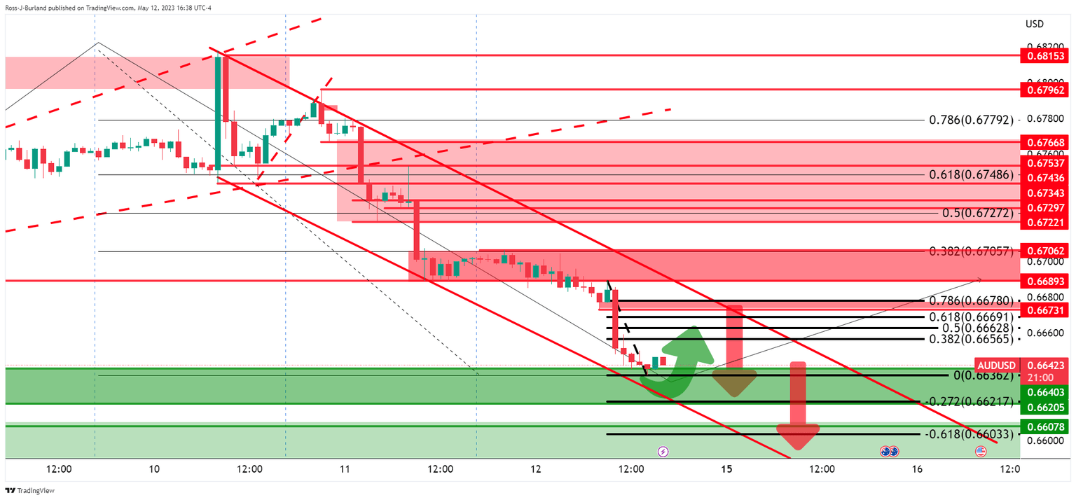 The bias is bearish while inside of the bearish channel. However, the bulls seem to be moving in from support which could be a theme for the open. There are prospects of a move into the trendline resistance prior to the next bear continuation for the forthcoming initial balance next week. To the contrary, a move above 0.6670 and outside of teh channel would put the bias in favour of the bulls.