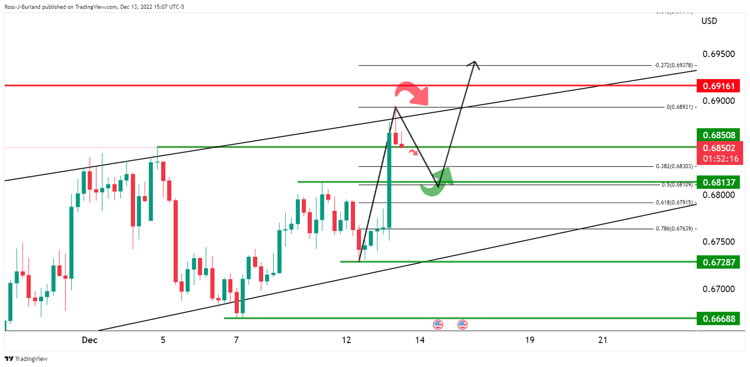 - AUD/USD bears seek a 50% mean reversion that meets prior resistance beat 0.6815, a level that guards 0.6800.