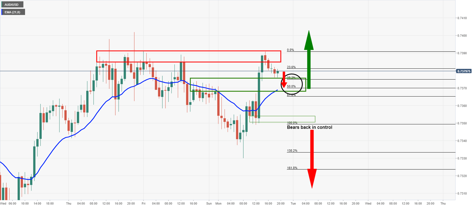 On a daily perspective, the price has corrected 50% from the prior bearish impulse near 0.7390 and bears are looking for an imminent optimal short entry point on the lower time frames: