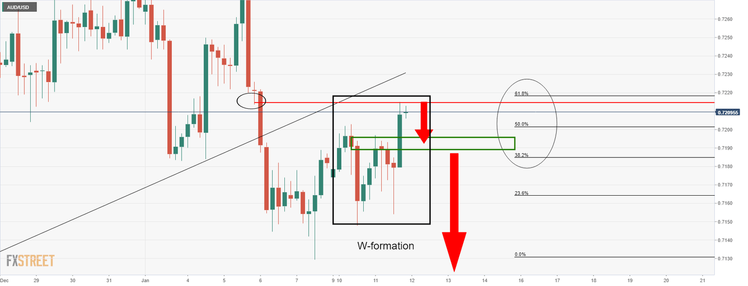 The W-formation might be expected to pull in the price to the neckline and if the bears take over there, then the downside will be to play for.