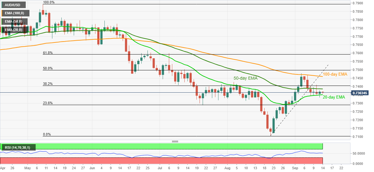 Hence, sellers await a downside break of the 20-day EMA level of 0.7350 to aim for 23.6% Fibonacci retracement of the May-August downside, near 0.7290.