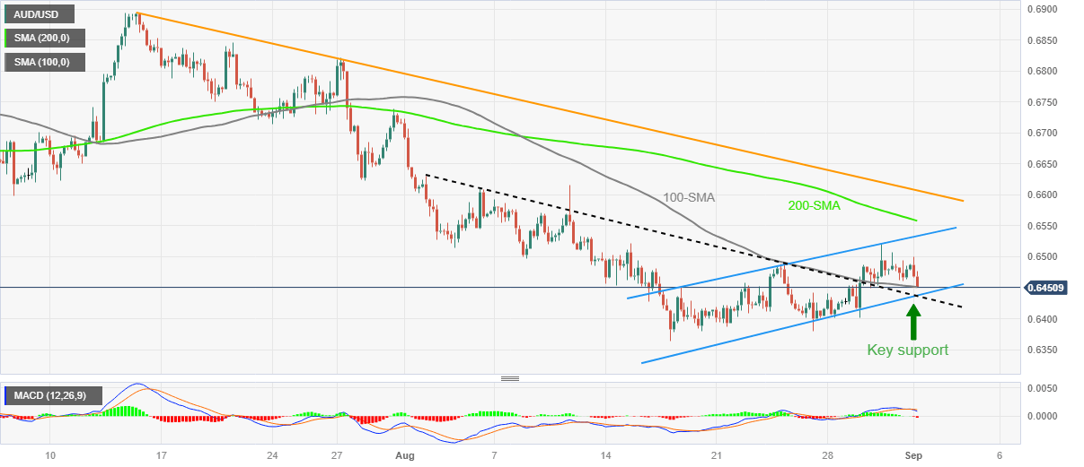 With this, the AUD/USD pair is likely to extend the latest weakness towards paring the first weekly run-up in seven. However, a convergence of the two-week-old rising trend channel’s bottom line joins the previous resistance line from mid-July, close to 0.6440-35, challenges the AUD/USD pair sellers.