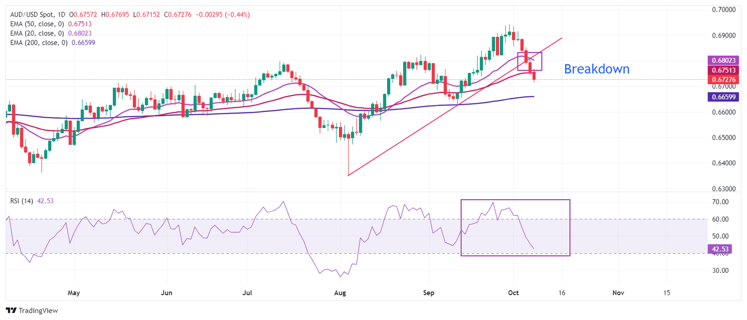 AUD/USD sees a sharp downside after a breakdown below the upward-sloping trendline plotted from the August 5 low around 0.6350. The Aussie asset slides below the 20- and 50-day Exponential Moving Averages (EMAs), which trade around 0.6800 and 0.6750, respectively.